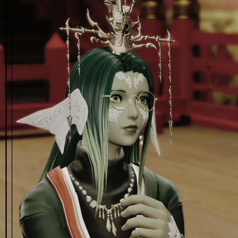 Scálaí's journey began in Sui-no-Sato. An ever-curious child, she was often caught wandering outside when she really shouldn't be, much to the chagrin of her parents.Her peculiar hues garnered much curiosity in the village, which eventually caught the attention of the Ruby Princess. She was invited to dance in the royal court, and spent several years dedicated to entrancing audiences from far-flung places. The ever-changing variety of patrons sparked her own curiosity once more, and when she had earned enough to support herself, she made plans to explore the world.Eventually, she convinced her parents that as long as she promised to come home to rest when needed, she was set free into the world, and found herself in Doma castle. She danced for yet more audiences, until the castle came crashing down and she had to find somewhere safe to be.Scálaí sought refuge in Kugane, with the proprietors of some of the most famous tea houses. Eventually, she discovered an innate love of brewing and blending teas, and her love of entertaining guests was swiftly rekindled. That's when she got an idea.Settling into an apartment in Lily Hills, Scálaí established Dragonpool. Designed with her favourite things in mind, she worked tirelessly to ensure a perfect space for tired adventurers to escape to. She uses her social connections to secure inexpensive but high quality ingredients for a wide range of teas to soothe the weary adventurer and provide a place to relax, among other things.She can often be found wandering Limsa Lominsa, where she partners with The Bismarck's kitchen to prepare hot meals at the behest of a local refugee resettlement programme. Her soups are a favourite among newcomers who've been placed at The Mizzenmast after a long journey.She may have her quirks, but she will always choose kindness and compliments when encountering new people. She also can't wait to introduce people to her beloved pet fish.